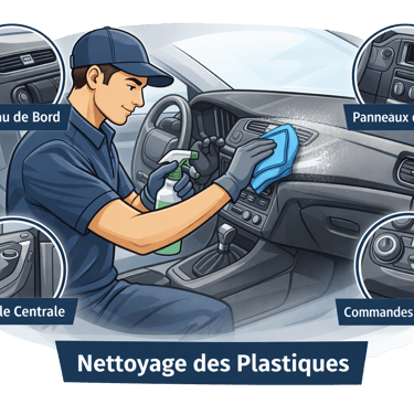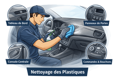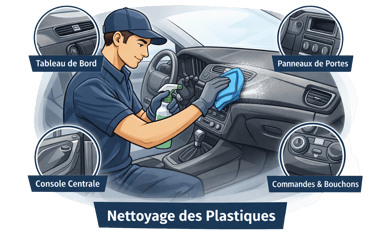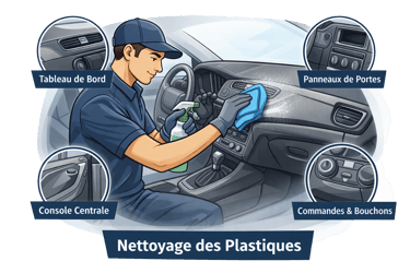 Nettoyage complet des plastiques (tableau de bord, panneaux de portes, commandes)