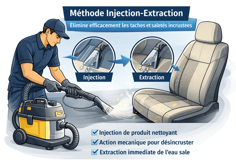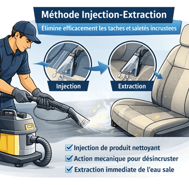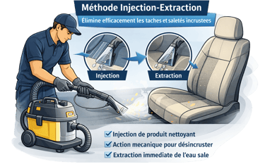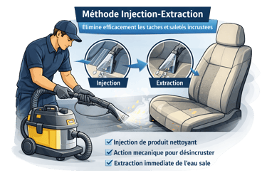 Pour les sièges et tapis en tissu, nous utilisons la méthode injection-extraction, reconnue comme l’une des plus efficaces.